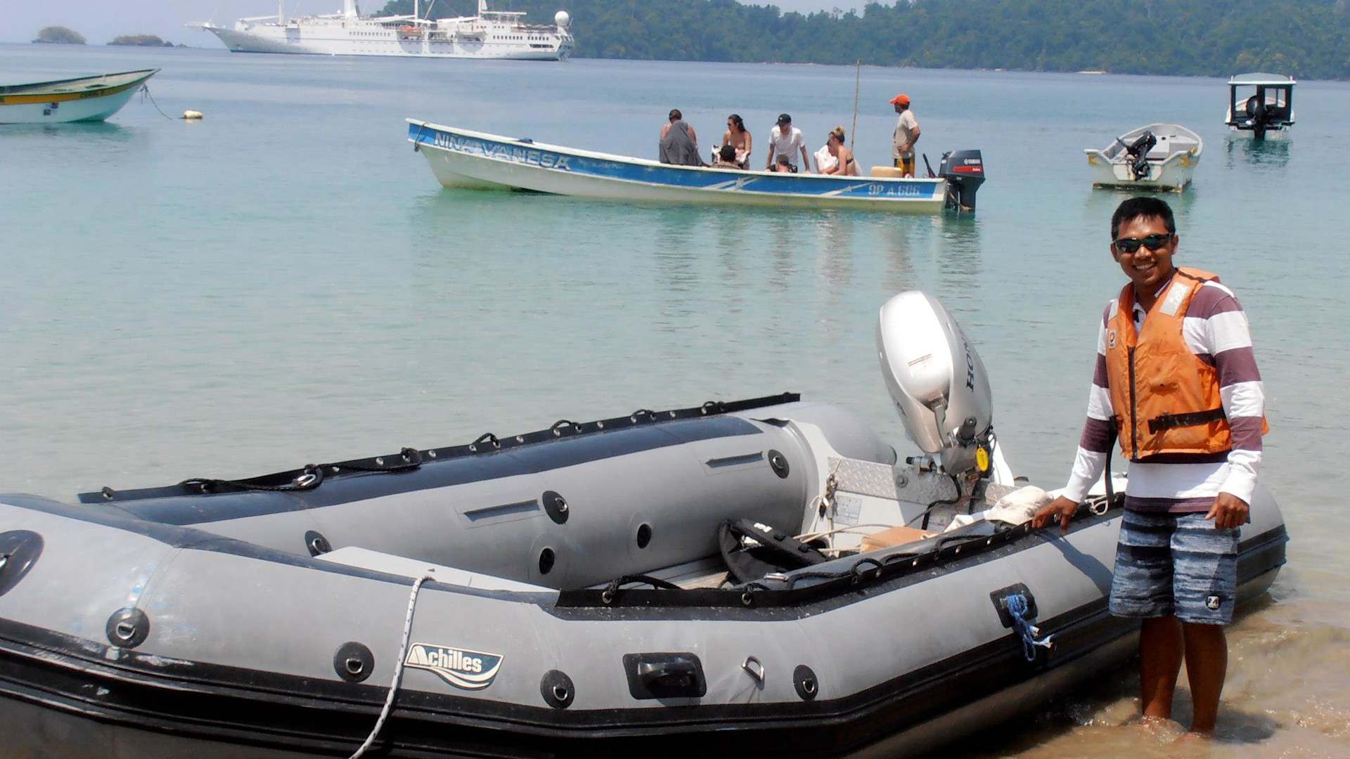 Windstar utilizes Zodiacs, rugged inflatable boats designed to take guests safely to remote ports with no docks. A wet landing consists of boarding a Zodiac from a floating dock on the yacht and riding it from the ship to the shore. Once you reach the beach, you will disembark directly in the water.