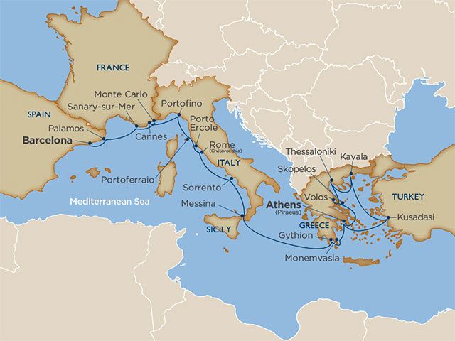 Swim the blue waters of Spain’s Costa Brava near Palamós. Explore an 11th century fortified castle that protected medieval villagers against pirates. Behold the beaches of Sanary-sur-Mer to the inimitable limestone cliffs of Cassis. Harken bygone eras of quiet shores and quaint fishing villages dotting the Côte d'Azur. Spot Arab and Norman influences in Messina, reflected in the horseshoe arches and decorative stonework of the town’s famous 12th century cathedral. Tour the ancient wonders around Gythion with the austere “Spartan” Greek design. Marvel in the Acropolis, with breathtaking monuments to Mythical deities like Zeus, Athena, and Poseidon. Tour Thessalonik's wealth of archaeological highlights including the iconic White Tower and Aristotelous Square. Live out your Mama Mia dream on the island of Skoplos, where many of the Hollywood films’ scenes were filmed.