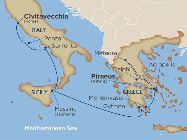 Enjoy the perfect blend of ancient marvels and breathtaking natural beauty on this Greece and Amalfi Cruise Tour. Delve deep into Greek and Roman history as you visit the home of the Oracle at Delphi, Meteora’s mystical monasteries, and the awe-inspiring ruins of Rome and Pompeii. Walk medieval lanes in Mystras and Monemvasia past a surprisingly harmonious mix of Byzantine castles, Norman churches and Moorish palaces. But don’t let the fascinating past overshadow the sheer beauty of the present. Appreciate every pixel of stone buildings covered with jasmine, oleander and bougainvillea. Cruise the dramatic coast of Sorrento and Amalfi, a tapestry of cliffs, grottoes, beaches and picturesque seaside towns. And linger in amazing gems like colorful Ponza with its gelato-colored buildings and tiny harbor – a place only big enough for small ships like ours.