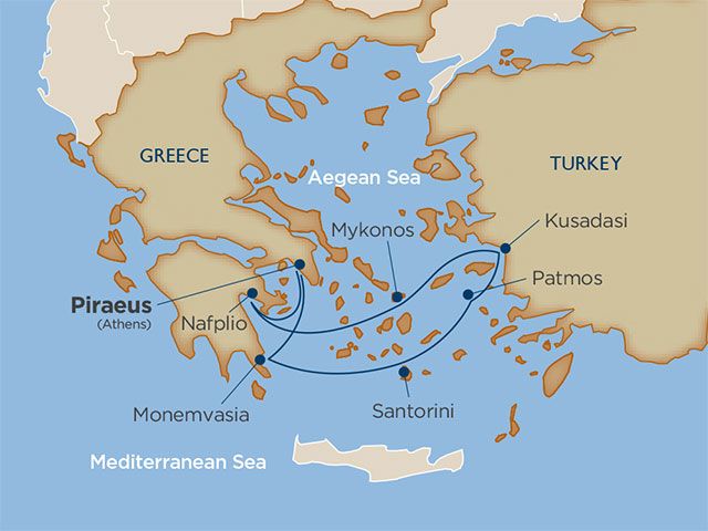 Spend full days in the Greek Isles with later evening visits in Santorini, Kusadasi, Patmos, and Mykonos.