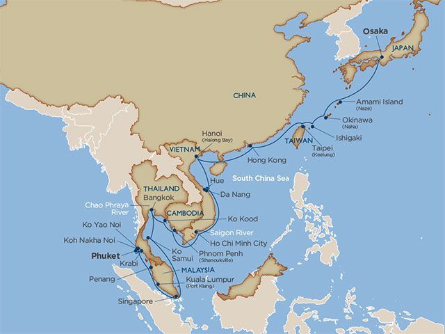 This month-long voyage will create a lifetime of memories, from pristine rural locales to glimmering neon cities. Step into a watercolor scene: longtail boats cruising the serene waters and karst pillars of Halong Bay, water buffalo tilling verdant rice paddies, vermilion torii guarding Shinto shrines, and magical Thai islands we’ve hand-selected from over 1,400 choices. Expand your culinary horizons with Peranakan fusion food in Malaysia and Singapore, Khmer noodles in Cambodia and Ishigaki’s melt-in-your-mouth beef. Browse the famous night markets during overnight stays in Hong Kong, Hanoi, Ho Chi Minh City and Singapore. Anchor it all with a better understanding of the past as you visit the National Palace Museum in Taipei, with one of the largest collections of Chinese art in the world, or Hoi An’s Ancient Town, with its beautifully preserved 18th-century merchant houses.