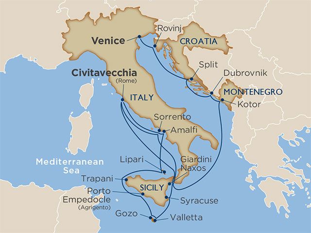 Roam between the broken monoliths and columns in the Roman Forum, Western Civilization’s former epicenter. Gaze across Catania’s umber-hued, terracotta-tiled skyline to the steaming summit of Mount Etna as you sample authentic Sicilian dishes. Sip citrus-sweet limoncello from frosty glasses. Land at the tiny port of Lipari in the Aeolian Islands north of Sicily, and explore a Norman Castle built in medieval times, or master the art of Sicilian-style pizzas as you combine local ingredients into your own culinary creation. Step inside the cool and shady Romanesque splendor of Kotor Cathedral in Montenegro, or venture to the nearby pedestrian-only village of Perast to sample sweets. Your delightful journey concludes in Venice among romantic gondolas and exquisite Italian architecture.
